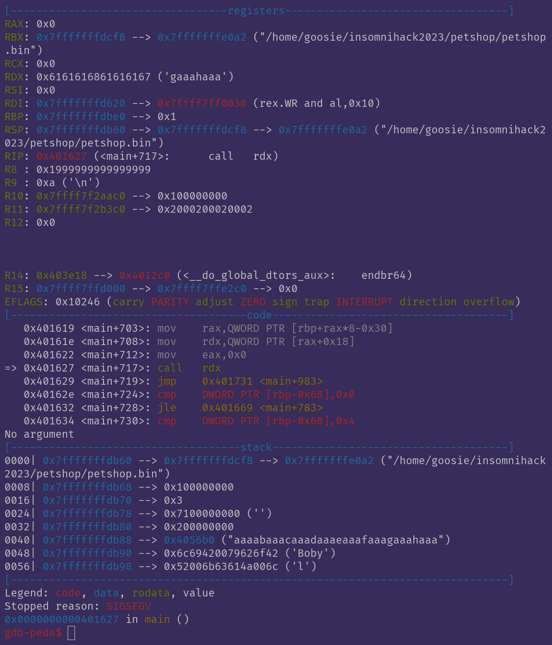 To verify; I used this function in gdb and sent a cyclic, then selected animal 0 again for the ability. Resulting in the crash: Here you can see that it tried to call rdx, which is currently user-controlled. Remember that pointer to the basicAbility that was stored on the allocated chunk belonging to the animal? That's supposed to be rdx.