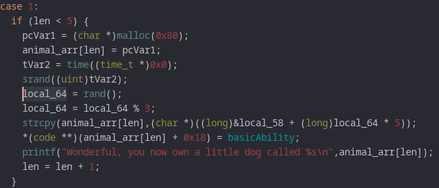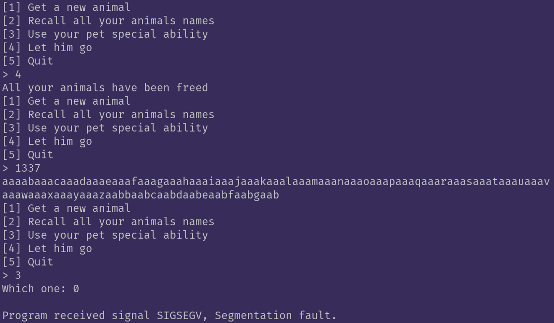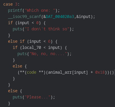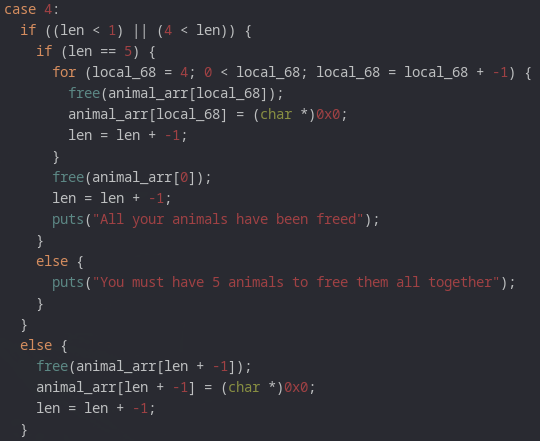 Freeing animals in the input description of the challenge already kind of gives something away, let's look at the decompiled code: This argument literally calls just free on all the animals in different ways depending on how many.