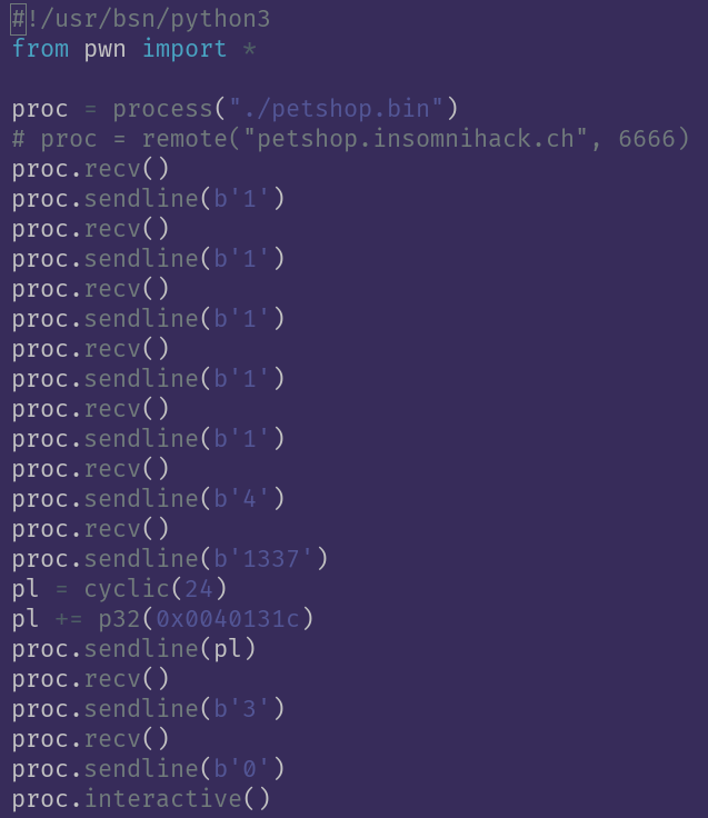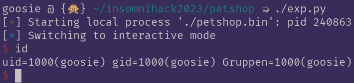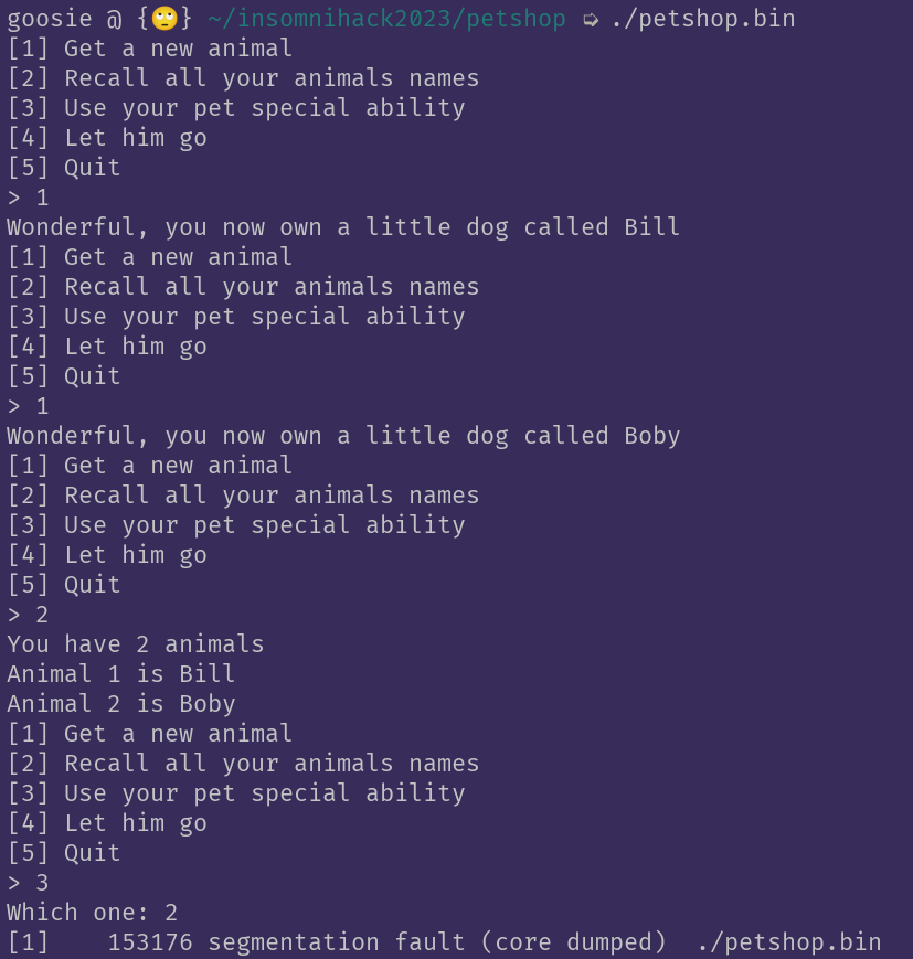 "petshop" was a category pwn challenge at the insomnihack 2023. It was a very simple address overwrite to exploit in the end, but involved a Use-After-Free/dangling pointer bug + a hidden malloc call and an off-by-one error in another function to trigger.
