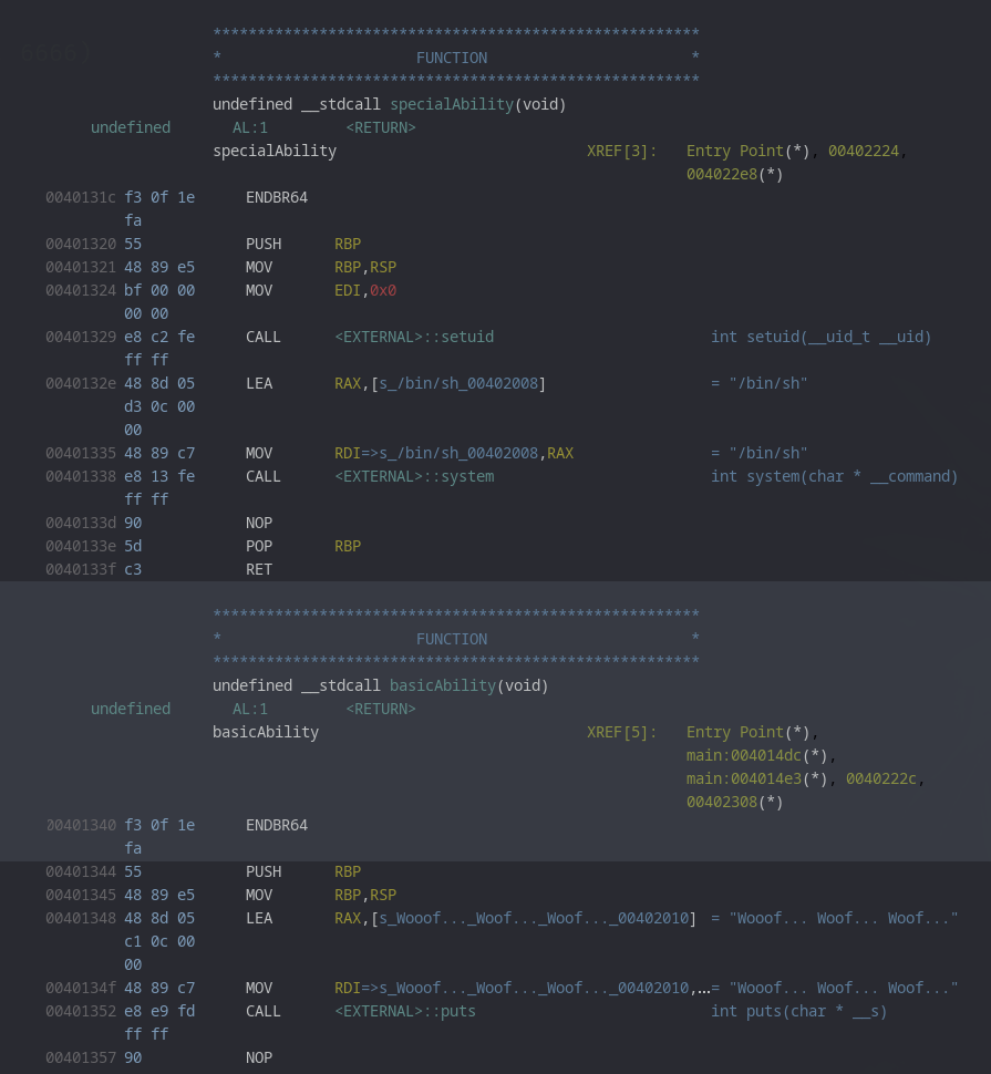 And the corresponding function is stored wherever a click takes me. Interestingly, this also reveals the target function called specialAbility:D It just does the /bin/sh dance.